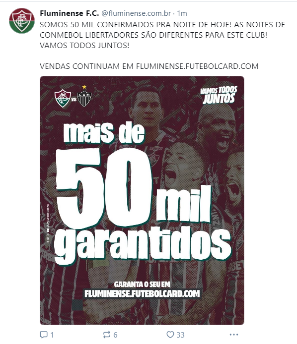Por intermédio de suas redes sociais, o Fluminense informou nova parcial da venda de ingressos para o jogo diante do Atlético-MG, nesta quarta-feira, às 19h, pela ida das quartas de final da Libertadores. Já são mais de 50 mil pessoas confirmadas no estádio.