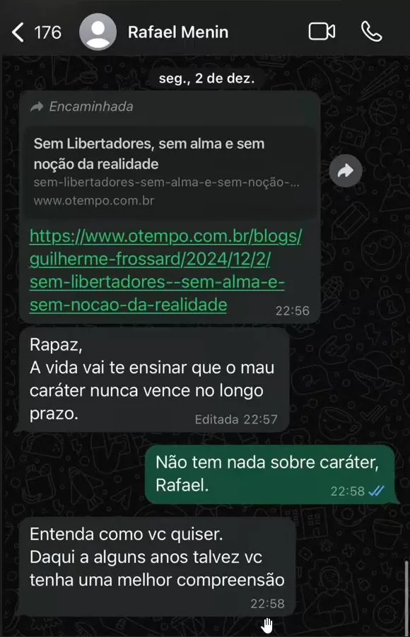 Uma polêmica envolvendo Rafael Menin, acionista da SAF do Atlético Mineiro, ganhou destaque após relatos de que ele teria ameaçado o jornalista Guilherme Frossard via WhatsApp. A ameaça estaria relacionada às críticas feitas por Frossard à gestão do clube, gerando um intenso debate sobre liberdade de imprensa e transparência no futebol.