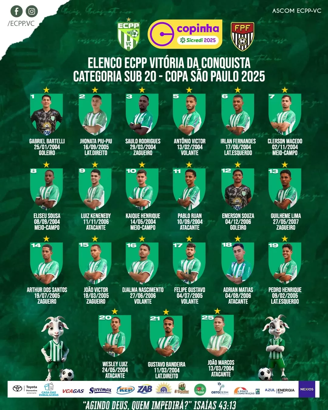 O Esporte Clube Primeiro Passo Vitória da Conquista, conhecido como “Bode”, anunciou oficialmente a lista dos atletas inscritos para a disputa da Copa São Paulo de Futebol Júnior 2024. Representando a Bahia, o time está no grupo 21, cuja sede é a cidade de Guaratinguetá (SP).