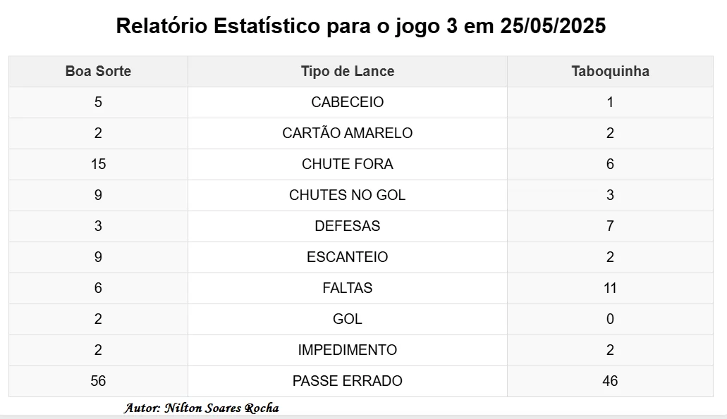 Analisando essas estatísticas da partida válida pelas quartas de finais da 4ª Copa Paraíso de Futebol 2025 entre os times Boa Sorte e Taboquinha, podemos tirar várias conclusões que ajudam tanto na avaliação de desempenho quanto na formulação de melhorias. Vamos aos pontos: