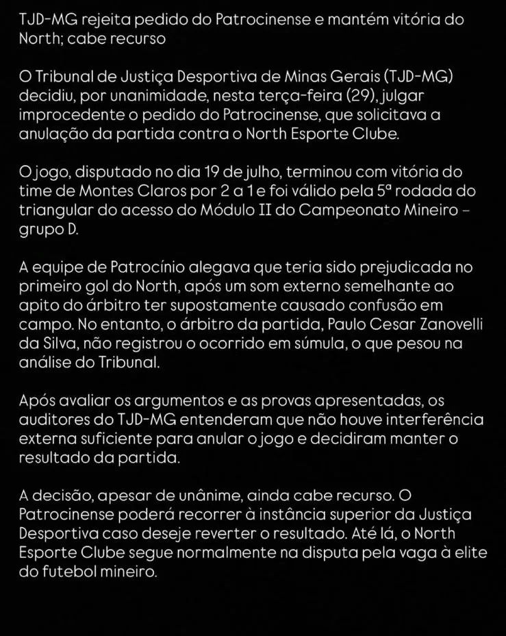 O Tribunal de Justiça Desportiva de Minas Gerais (TJD-MG) decidiu, por unanimidade, nesta terça-feira (29), manter o resultado da partida entre North Esporte Clube e Patrocinense, disputada no dia 19 de julho, pela 5ª rodada do Triangular Final do Módulo II do Campeonato Mineiro. Com isso, a vitória por 2 a 1 do time de Montes Claros permanece válida.
