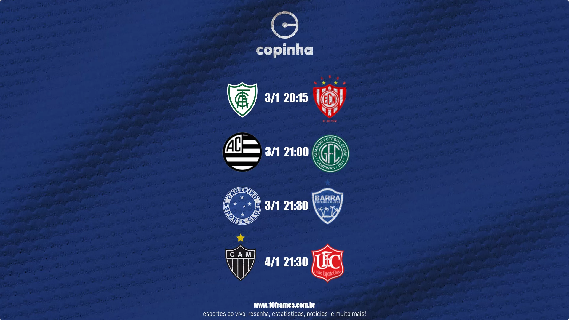 No sábado (03/01), o América-MG abre a participação mineira às 20h15, diante do Noroeste, com transmissão pelo YouTube Paulistão. Logo em seguida, às 21h, é a vez do Athletic-MG enfrentar o Guarani, também com exibição no YouTube Paulistão. Fechando a noite, o Cruzeiro encara o Barra-SC às 21h30, com transmissão pela CAZÉTV.