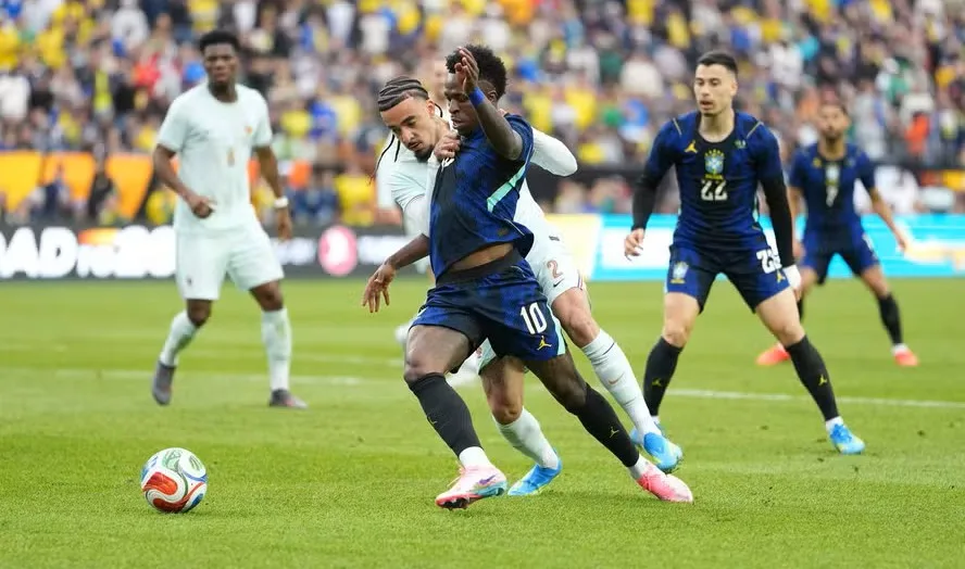 Mesmo escalado com um quarteto ofensivo — formado por Matheus Cunha, Gabriel Martinelli, Raphinha e Vinícius Júnior —, o time comandado por Carlo Ancelotti teve dificuldades para se impor na etapa inicial. A França, dirigida por Didier Deschamps, controlou as ações e explorou erros brasileiros com precisão.